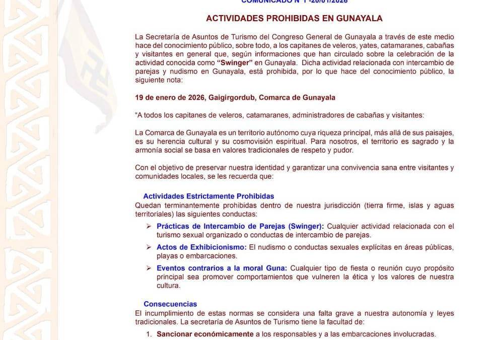 El Congreso General de Gunayala, a través de su Secretaría de Asuntos de Turismo, reiteró que están estrictamente prohibidas las fiestas swinger, el intercambio de parejas, el nudismo y cualquier actividad de carácter sexual explícito dentro del territorio comarcal, incluyendo tierra firme, islas y aguas territoriales.