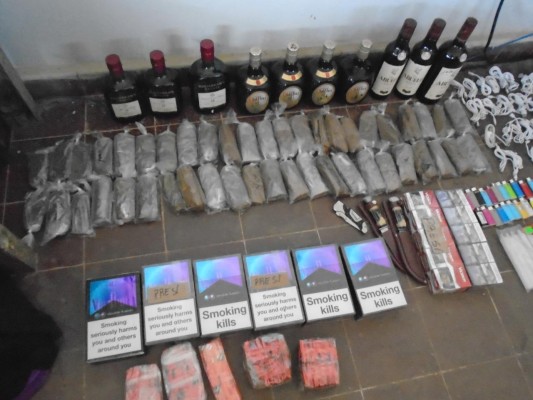 Entre los artículos encontrados habían botellas de licor de diferentes tipos, un router, celulares, cable USB, audífonos, bocinas con bluetooth, cargadores de celular, chip de celular, cigarrillos, encendedores, pesa digital, ropa, hoja de papel filling, coladores pequeños, cuchillos, velas, entre otros.