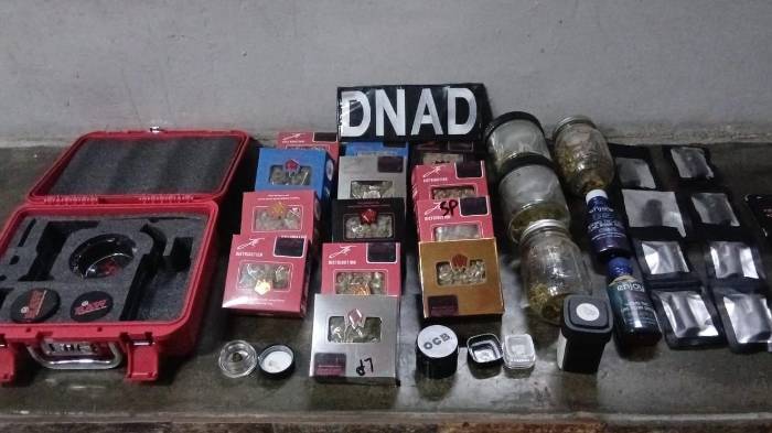 Entre los indicios decomisados se hallaron frascos de vidrio y plástico con materia vegetal que se presume es marihuana, cigarrillos electrónicos con aceites de posible droga, líquidos etiquetados con inscripciones de THC y THC+CBN, siete fragmentos sólidos traslúcidos presuntamente de “piedra”, una sustancia gelatinosa también sospechosa, trituradores, 13 cajetas pequeñas con más material vegetal, un teléfono celular y $210.00.