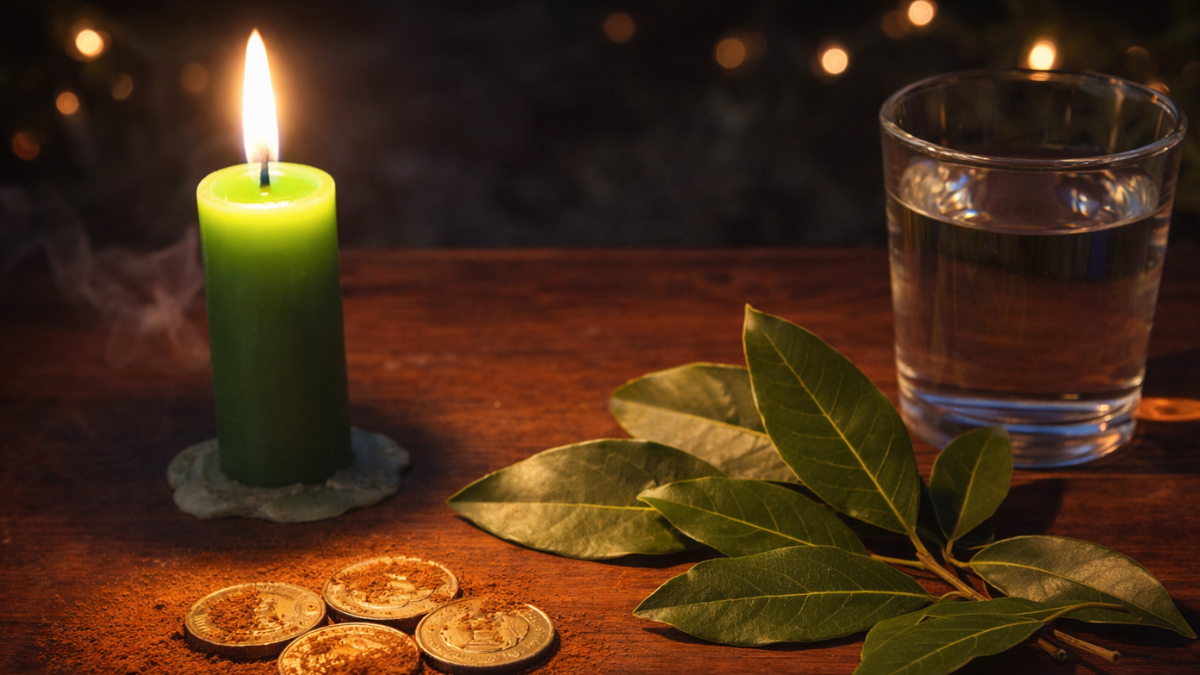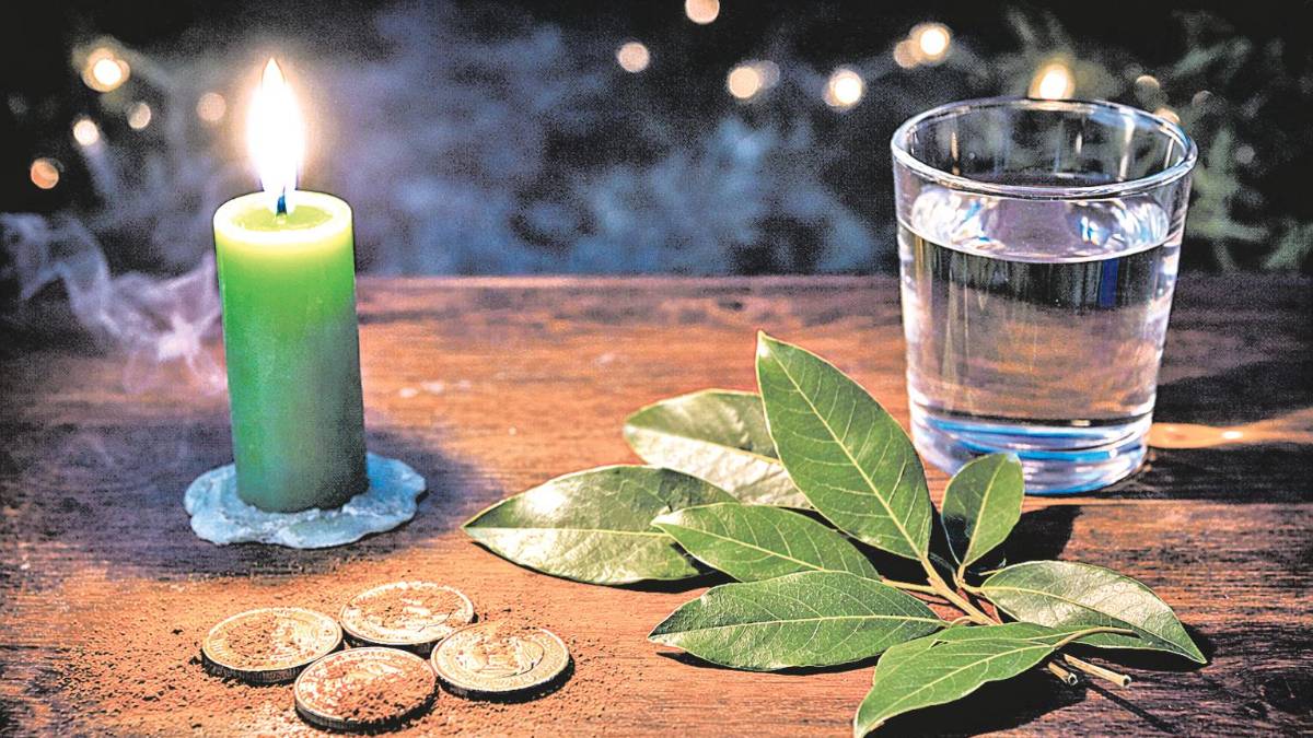 Busca un espacio tranquilo y reúne los siguientes elementos: una vela verde (símbolo de dinero), tres monedas, una rama o hoja natural (puede ser de laurel o cualquier planta que tengas), un poco de canela en polvo y un vaso con agua. Coloca todo sobre una superficie limpia, preferiblemente de madera, y hazlo de noche, en un ambiente relajado.