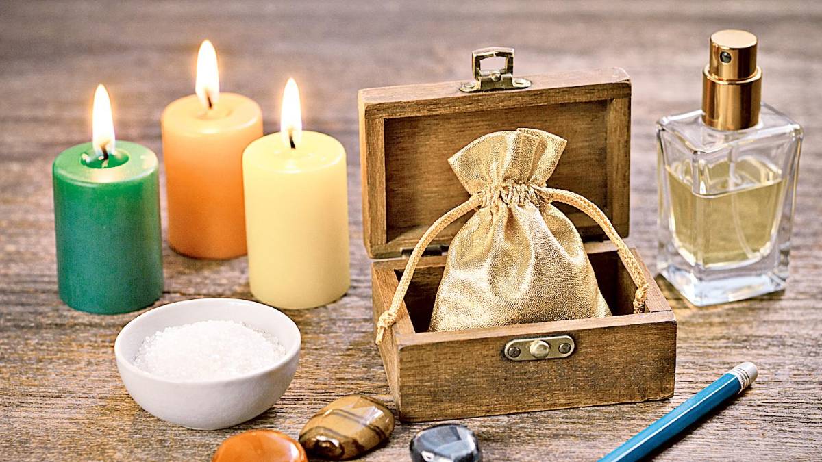 Para prepararlo necesitas tu perfume personal, velas de colores amarillo, naranja y verde, azúcar, una bolsita dorada, un lápiz, una cajita de madera y tres piedras energéticas: cornalina, ojo de tigre y acerina. Cada uno simboliza prosperidad, fuerza y movimiento en los negocios.