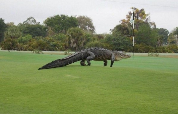 Sorprendente. Algunos jugadores de golf que visitaban el Myakka Pines Golf Club en Florida, Estados Unidos, salieron corriendo del campo, luego de percatarse que un cocodrilo gigante se paseaba libre por uno de los hoyos. El gigantesco reptil se dirigía de un estanque a otro, de repente, el cocodrilo decidió tomar un baño de sol y se acostó al lado de una pelota de golf. El portal oficial del Myakka Pines Golf Club posteó una foto donde se observan las dimensiones del animal. Se calcula que el animal medía poco más de 4 metros de largo, sin embargo.