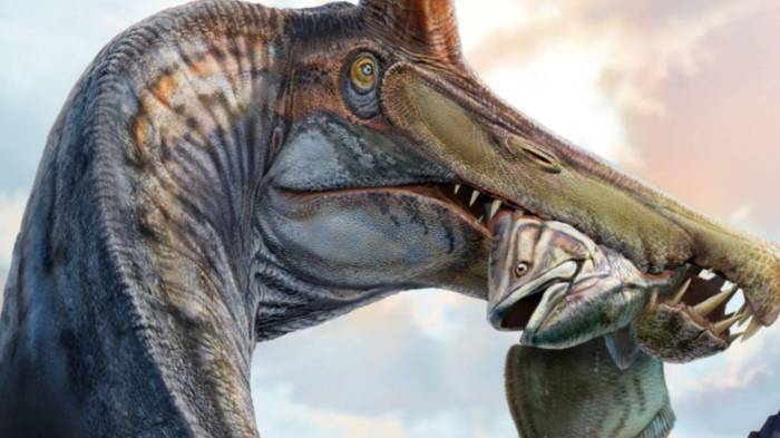 El análisis de varias de las medidas, como el cráneo, el cuello o las extremidades traseras, sitúan a los gigantes espinosáurios cercanos a aves zancudas como las garzas, y los investigadores han sugerido que su evolución se produjo a lo largo de tres fases durante un periodo que se prolongó durante 50 millones de años en una región geográfica restringida alrededor del mar de Tetis (anterior a la aparición del océano Índico y del Mediterráneo).