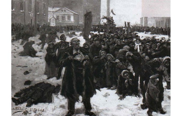 Represión.- En un día como hoy, pero del año 1905, en San Petersburgo (Rusia) tiene lugar el denominado "Domingo Sangriento" en el que murieron cientos de trabajadores y sus familias durante la represión a una marcha pacífica que quería entregar al Zar una petición de mejoras laborales, que no responde a ninguna consigna política. La gente es salvajemente atacada por soldados de infantería y tropas cosacas. El zar ha abandonado previamente la ciudad temiendo por su seguridad. Nunca más el pueblo y el zar se reconcilian.