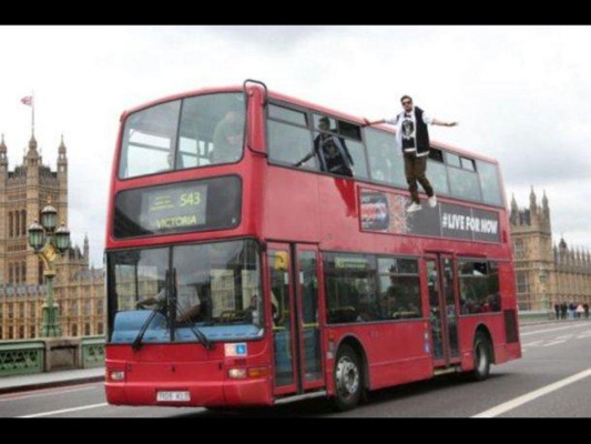 El ilusionista Dynamo cautiva a los turistas en Westminster, Inglaterra. Al levitar ( efecto por el que un cuerpo u objeto se halla en suspensión estable en el aire) en el lateral de un autobús de dos pisos de altura.