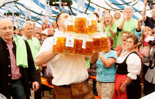 Logró récord por cargar 27 jarras de cerveza