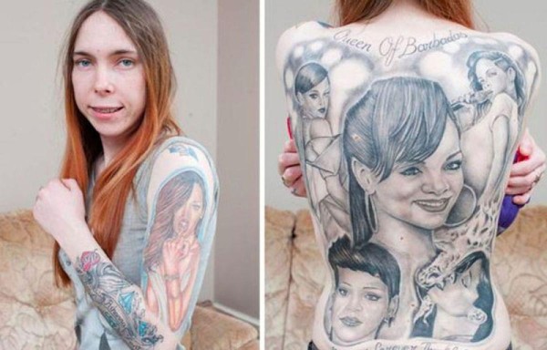 Obsesión. Sarah Ridge ha demostrado que es capaz de llegar bastante lejos, con tal de demostrar su total devoción hacia la estrella pop. Ridge ha cubierto una importante parte de su cuerpo con retratos y canciones de Rihanna. En su espalda se pueden ver cuatro imágenes acompañadas con la frase ‘Reina de Barbados’. Además ha procurado hacerse tatuajes exactos a los que tiene la cantante, como la diosa egipcia que tiene justo debajo de los senos, en honor a su difunta abuela. La chica de 23 años tiene en total 14 tatuajes.
