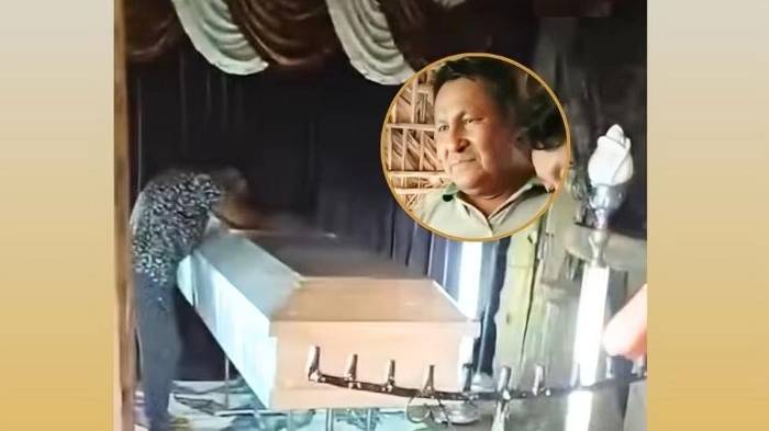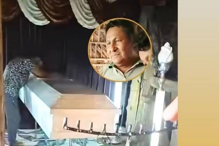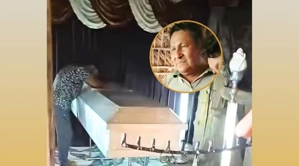 El video que circula en redes sociales se ha hecho viral, y muestra al hombre que ingresa caminando al lugar y ve el velorio.