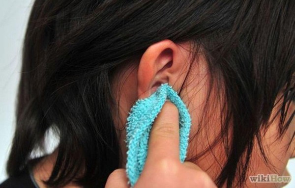 Limpia el exterior del oído con un paño humedecido remojado en agua tibia (no tan caliente). Usa tu dedo meñique en conjunto con la toallita para entrar y limpiar la parte de adentro del oído. Haz esto solo en la parte de afuera.