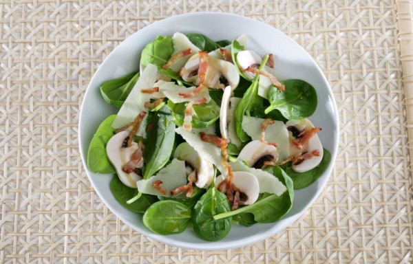 Ensalada de espinacas, champiñón, bacón y queso