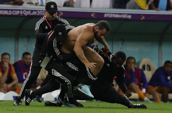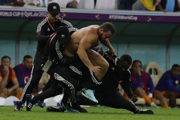 Miembros de la seguridad del estadio detuvieron a un hincha que invadió el campo en el partido de los cuartos de final del Mundial de Fútbol Qatar 2022 entre Países Bajos y Argentina en el estadio de Lusail. Argentina venció en penaltis 4-3 a Países Bajos.