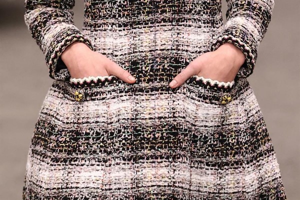 El metalizado se convierte en la clave de los trajes "tweed", un clásico de la firma, que los revisita en chaquetas largas, minivestidos, shorts e incluso vestidos largos bordados con lentejuelas.