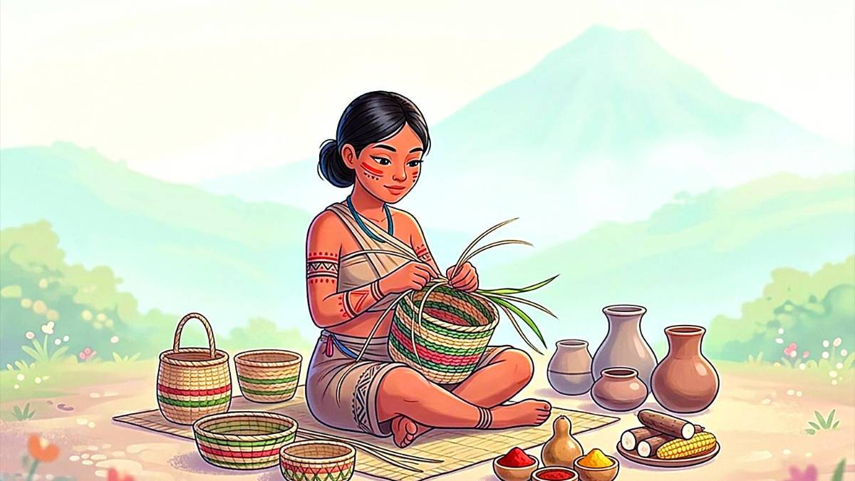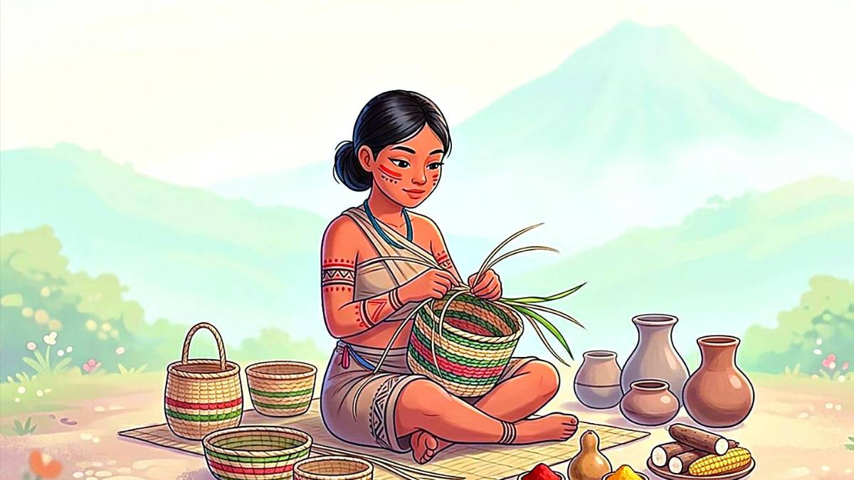Ella tomaba los bejucos y las hojas de las plantas con sus delicadas manos, e iba tejiendo los canastos, las esteras que utilizaba para avivar el fuego.