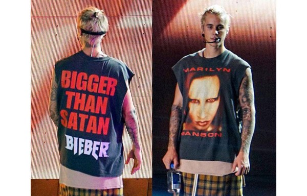 En medio del recital que ofreció el pasado fin de semana en la ciudad de Vancouver, en su natal Canadá, Justin Bieber hizo un llamativo cambio de vestuario en el que lució una camiseta, que en la parte delantera llevaba la cara del rockero Marilyn Manson y que por detrás dejaba ver el mensaje… ‘Más grande que Satán, Bieber'. ¿Por qué Justin llegó a esa conclusión?