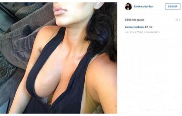 'sexy'. Aunque nos tiene acostumbrados a sus sexis fotos a través de las redes sociales, esta vez, Kim Kardashian sorprendió con una foto exclusivamente de su escote y puso un mensaje en español. Kim Kardashian escribió en sus redes sociales: ‘42 mil', tal vez para saber si sus fotos pueden superar esa marca, algo que fácilmente logró en unas horas.