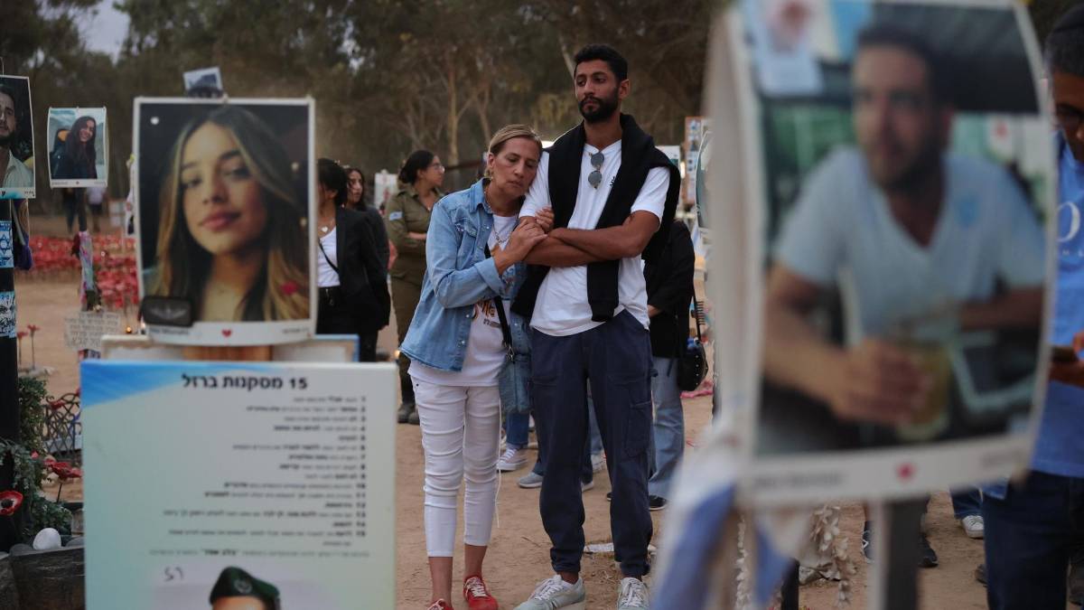 Un año de guerra y 97 rehenes en GazaAlejado de la multitud de casi mil asistentes, en un pequeño homenaje con bancos presidido por la foto de tres jóvenes, se sienta Omer, abatido. Las tres víctimas de la imagen son su hermano, la novia de este y otra amiga.
