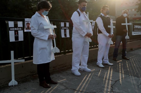 Trabajadores de la salud, con máscaras protectoras, colocan cruces al lado de carteles donde se lee "héroes" y con imágenes de compañeros de trabajo que murieron a causa del coronavirus, en las calles de Sao Paulo, Brasil.