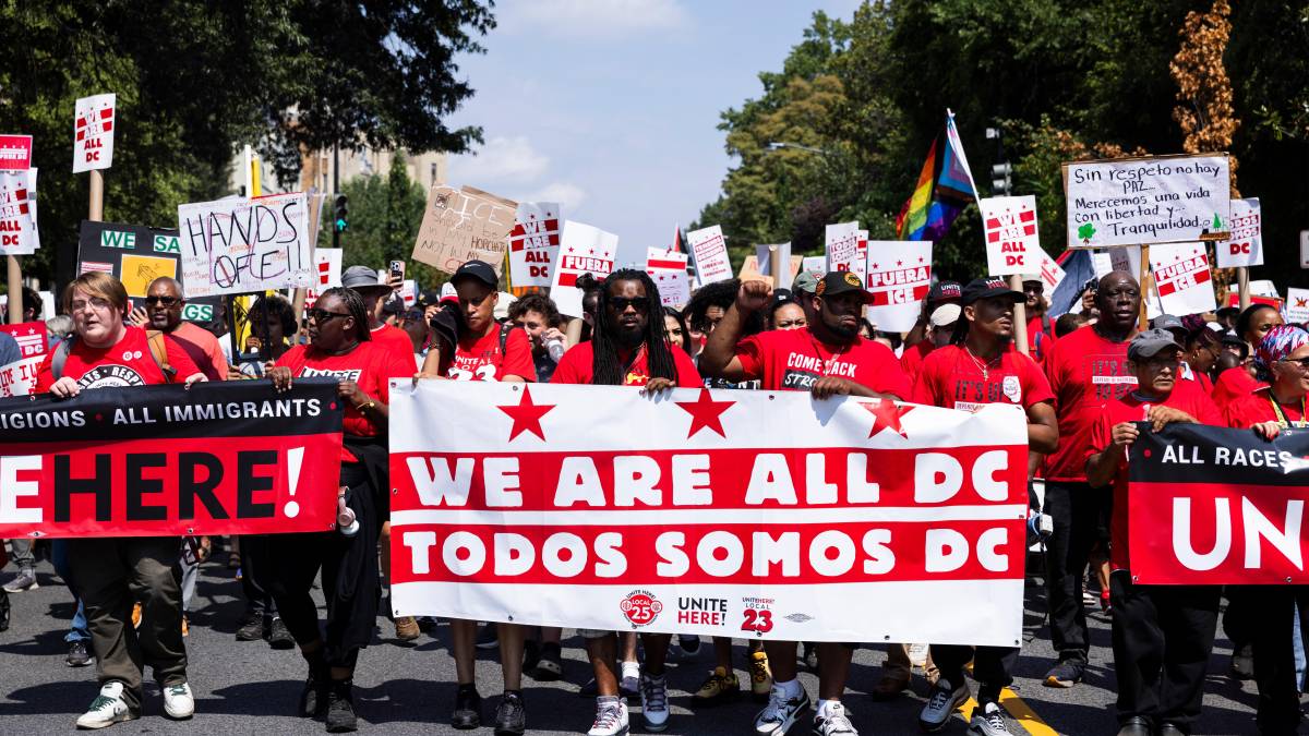 Cientos de residentes de Washington, la capital de Estados Unidos, salieron a las calles ayer para protestar por el acoso y la detención de migrantes en la ciudad por parte de la Guardia Nacional y otras agencias federales desplegadas en la urbe por orden del presidente Donald Trump.