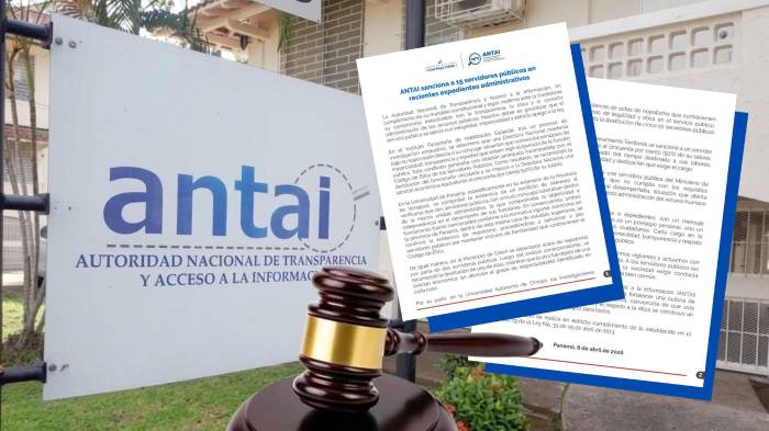 Tras un proceso de investigación, la Autoridad Nacional de Transparencia y Acceso a la Información (ANTAI) sancionó a 15 servidores públicos en distintos expedientes administrativos, en los que se detectaron nepotismo, conflictos de interés y violaciones a normas éticas en el ejercicio de sus funciones.