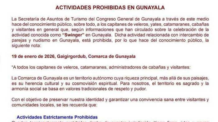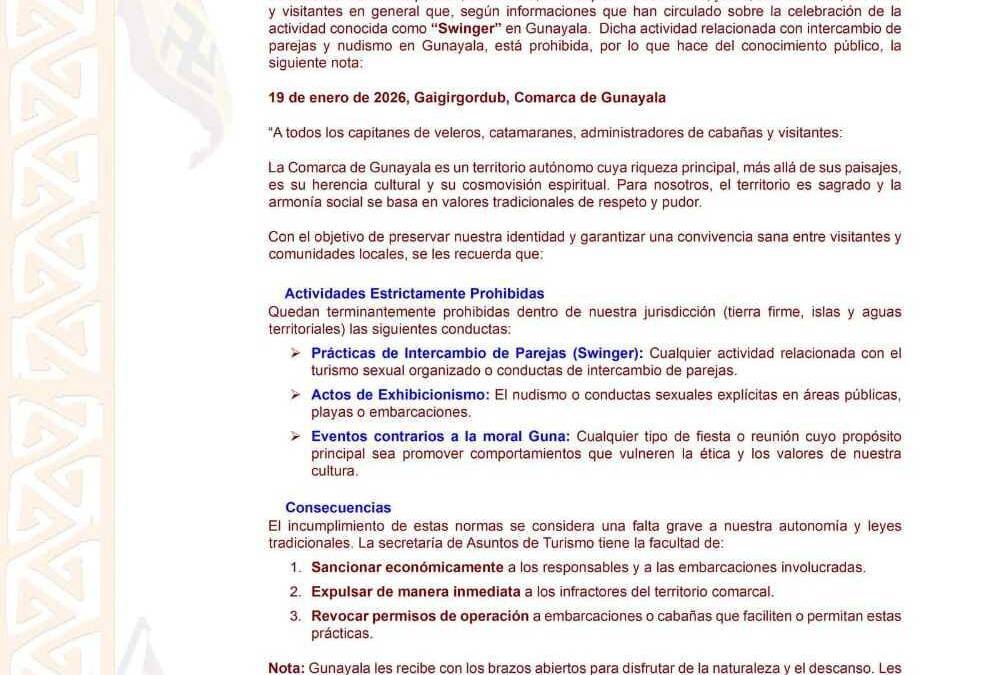 El Congreso General de Gunayala, a través de su Secretaría de Asuntos de Turismo, reiteró que están estrictamente prohibidas las fiestas swinger, el intercambio de parejas, el nudismo y cualquier actividad de carácter sexual explícito dentro del territorio comarcal, incluyendo tierra firme, islas y aguas territoriales.