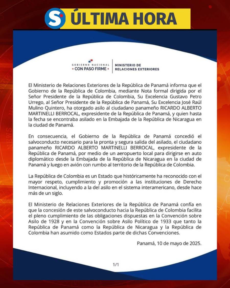 Fue mediante un comunicado, la noche de este 10 de mayo, que el Ministerio de Relaciones Exteriores de Panamá informó que había recibido nota formal del presidente de Colombia, Gustavo Petro, donde le se concedía asilo a Martinelli.
