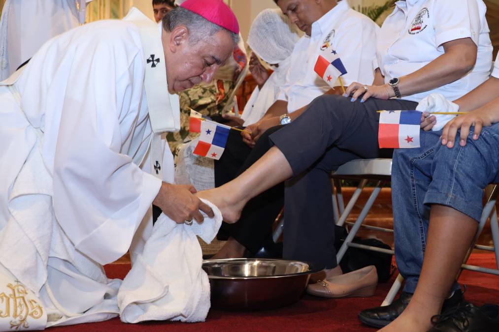 En la celebración de este jueves santo, el arzobispo de Panamá, monseñor José Domingo Ulloa, realizó el ritual cristiano de lavar los pies a un grupo donde había migrantes extracontinentales, personas en situación de calle, a una familia y jóvenes.