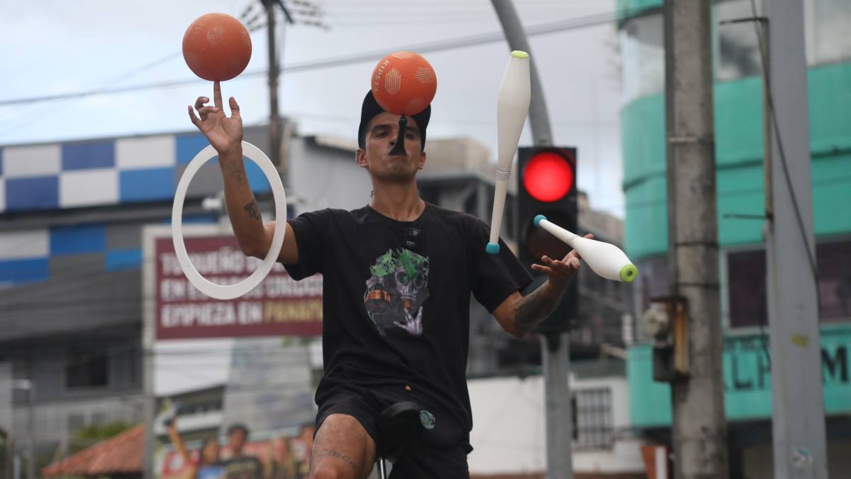 Desde hace unas semanas, su última parada es Panamá, donde se le puede ver elevándose varios metros sobre el asfalto en plena Calidonia, haciendo malabares mientras el reloj del tránsito marca el ritmo de su función.